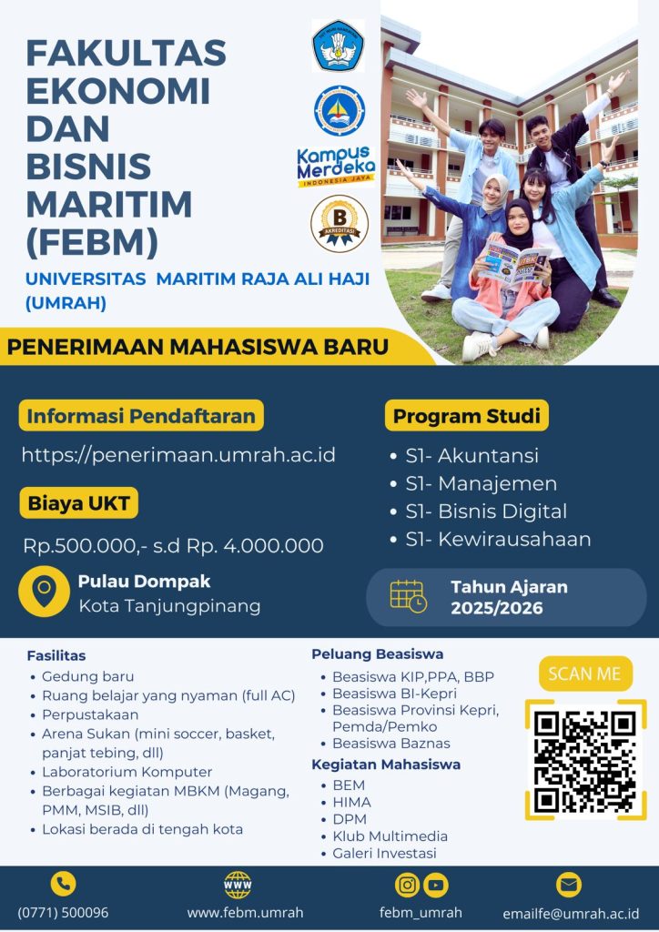 Untuk informasi lebih lanjut, kunjungi situs resmi: https://penerimaan.umrah.ac.id dan https://linktr.ee/febmumrah