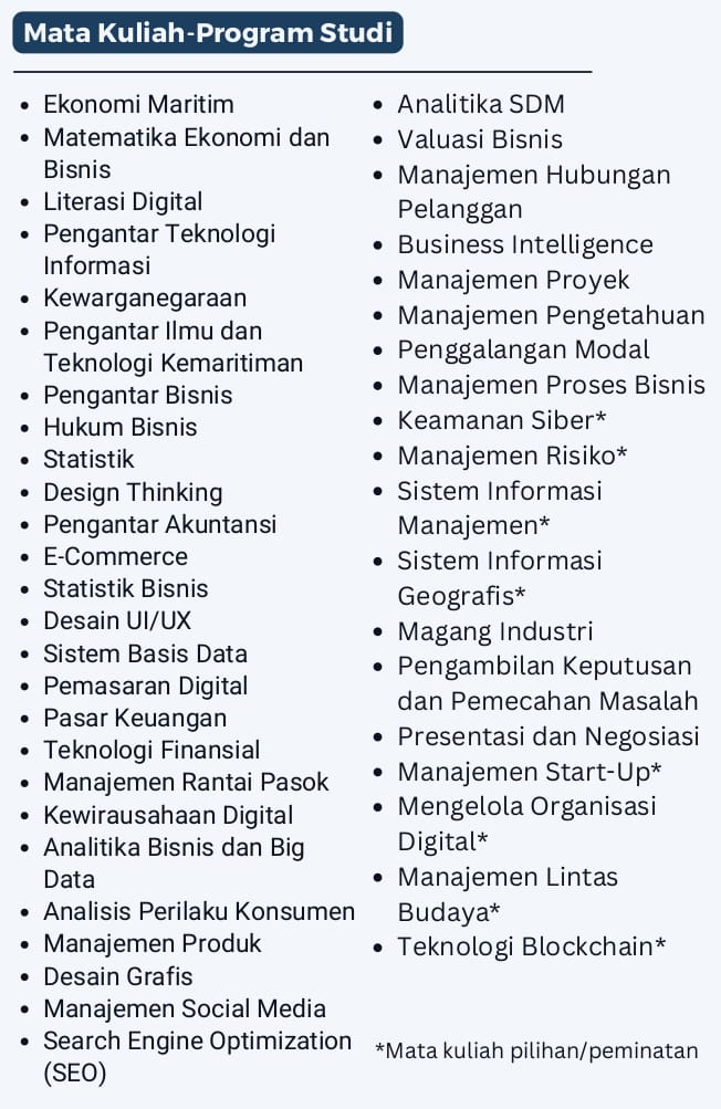Kurikulum Program Studi Bisnis Digital FEBM UMRAH dirancang untuk membekali mahasiswa dengan pengetahuan dan keterampilan yang relevan di era digital. Berikut adalah beberapa mata kuliah unggulan yang ditawarkan: