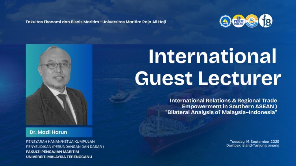 Acara ini menghadirkan narasumber Dr. Mazli Harun dari Fakulti Pengajian Maritim, Universiti Malaysia Terengganu (UMT), dengan mengangkat tema “International Relations & Regional Trade Empowerment in Southern ASEAN: Bilateral Analysis of Malaysia-Indonesia.”