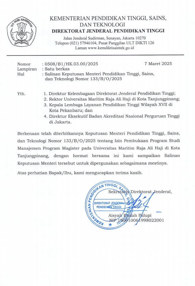 Kabar baik datang bagi dunia pendidikan tinggi di Kepulauan Riau. FEBM UMRAH kini resmi membuka Program Studi S2-magister Manajemen. Hal ini berdasarkan Keputusan Menteri Pendidikan Tinggi, Sains, dan Teknologi Nomor 133/B/O/2025 yang telah diterbitkan pada tanggal 6 maret 2025.
