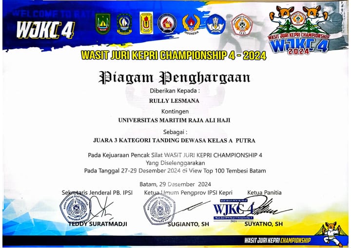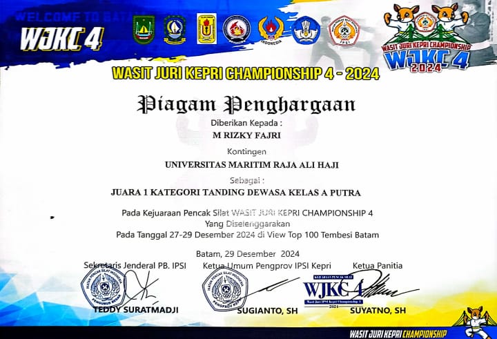 Dalam kejuaraan tersebut, M Rizky Fajri mahasiswa Program Studi Manajemen FEBM UMRAH berhasil meraih juara 1 kategori tanding dewasa kelas A putra. Sementara itu, Rully Lesmana yang juga merupakan mahasiswa Manajemen FEBM UMRAH mengukir prestasi dengan meraih juara 3 pada kategori yang sama. Prestasi ini menunjukkan dedikasi, kerja keras, semangat juang dan kemampuan luar biasa mereka dalam menghadapi lawan dari berbagai latar belakang.