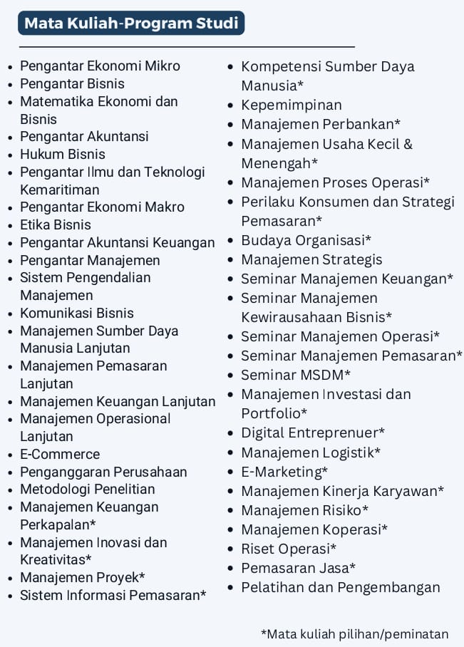 Program Studi Manajemen FEBM UMRAH menawarkan kurikulum yang dirancang untuk membekali mahasiswa dengan pengetahuan dan keterampilan yang relevan di dunia kerja. Berikut beberapa mata kuliah unggulan yang dapat Anda pelajari: