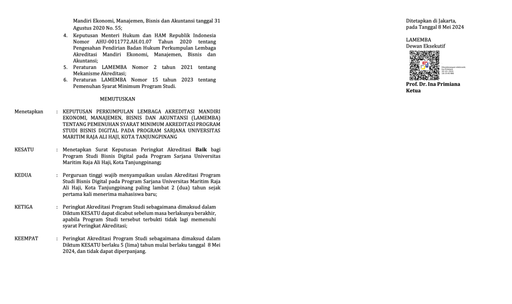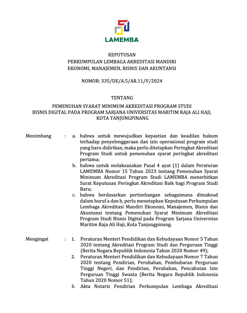 Program Studi Bisnis Digital di Fakultas Ekonomi dan Bisnis Maritim (FEBM) Universitas Maritim Raja Ali Haji (UMRAH) didirikan sebagai respons terhadap kebutuhan zaman di era digitalisasi dan revolusi industri 4.0. Dengan perkembangan pesat teknologi digital, dunia bisnis mengalami transformasi yang signifikan, menuntut sumber daya manusia yang memiliki literasi digital, kemampuan adaptasi, serta keterampilan sosial dan kreativitas yang tinggi. UMRAH, sebagai Perguruan Tinggi Negeri (PTN) yang memfokuskan pengembangannya pada bidang kemaritiman, memiliki peran strategis dalam mendukung visi-misi kemaritiman Pemerintah Republik Indonesia. Dengan semboyan “Menuju Tamadun Maritim,” UMRAH berkomitmen untuk mengoptimalkan potensi sumber daya kelautan guna mencapai peradaban maritim yang lebih maju. Oleh karena itu, penguatan sektor bisnis berbasis digital menjadi langkah penting dalam mengembangkan ekosistem maritim yang modern dan kompetitif.